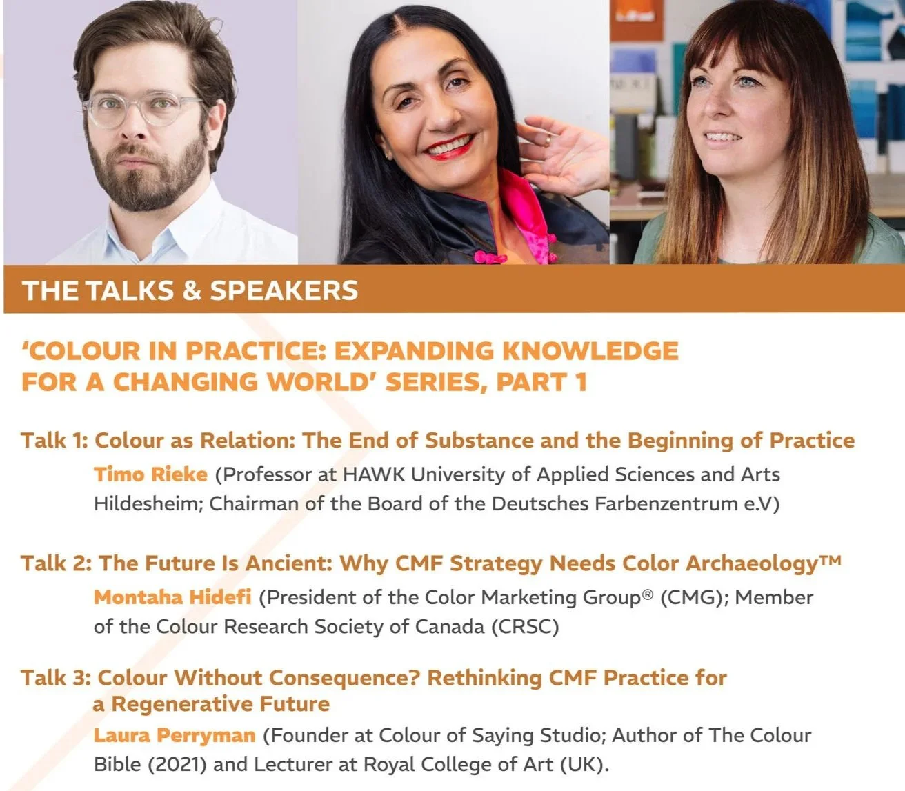 With: Timo Rieke (HAWK University of Applies Science & Arts Hildesheim), Montaha Hidefi (President, Color Marketing Group® (CMG)), and Laura Perryman (Designer, Author and Lecturer)